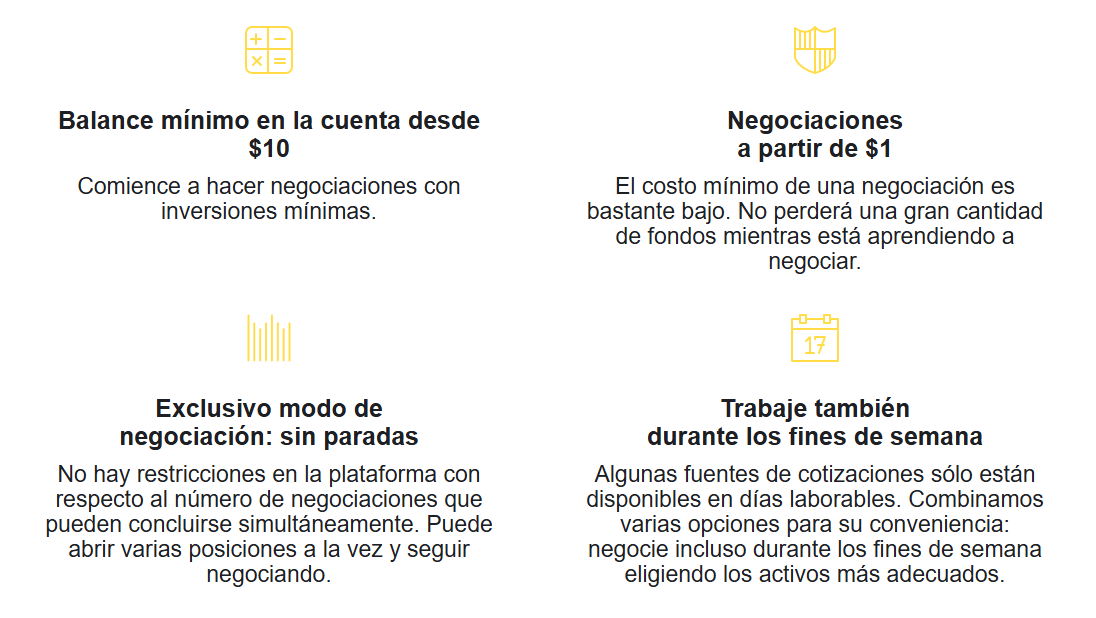 Con su interfaz intuitiva, su sistema de trading Non-Stop, los torneos motivadores, el programa de afiliados rentable y la cuenta demo gratuita, tienes todo para comenzar tu camino hacia el éxito financiero.